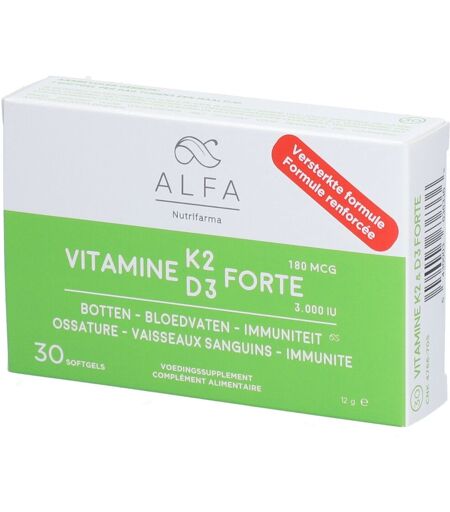 Complément alimentaire à utiliser dans le cadre d’une alimentation variée, équilibrée et d’un mode de vie sain.NOUVELLE FORMULE : quantité plus élevée de vitamine D3 !Cette formule contient du Menaq7 : une vitamine K2 et de la vitamine D3 brevetées, dérivées de la nature et sans allergène ni soja. Alpha Vitamin K2D3 Forte contient de l'huile d'olive qui augmente l'absorption des vitamines K2 et D3 par l'organisme. Les ingrédients dans Alfa Vitamine K2 - D3 Forte contribuent au maintien d'un coeur et d'os normaux ainsi qu'à un taux de calcium normal dans le sang et au maintien d'une fonction musculaire normale*.* La vitamine D contribue au maintien d'os et de muscles normaux et à un taux de calcium normal dans le sang. La vitamine K contribue au maintien d'os normaux.IngrédientsOlea europaea L., (enrobage) gélatine, glycérol et eau, Menaquinone-7, Cholecalciferol.Données nutritionnellesIngrédients par softgelQuantité activeAR*Vitamine K2 (ménaquinone-7)180 mcg240 %Vitamine D3 (cholécalciférol)75 mcg - 3000 IU1500 %Huile d'olive248 mg * AR = Apports de RéférenceNe contient pas d’allergènes.Conseils d'utilisations1 softgel par jour au cours des repas.Précautions d'emploiConserver dans un endroit frais et sec.Tenir hors de portée des enfants.Ne pas dépasser la dose recommandée.Ne convient pas aux enfants de moins de 11 ans. Attention particulière pour les patients prenant des anticoagulants coumariniques (acénocoumarol, fenprocoumone ou warfarine), car la vitamine K2 a un effet réparateur sur l’artériosclérose. Une vérification régulière de la tension artérielle est recommandée.Consultez votre professionnel de la santé ou votre pharmacien en cas d’utilisation concomitante de médicaments et / ou en cas de doute.Poids net30 capsulesFabricantFabricant :Nutrifarma nvCederstraat 18A2220 Heist-op-den-BergBelgique ...