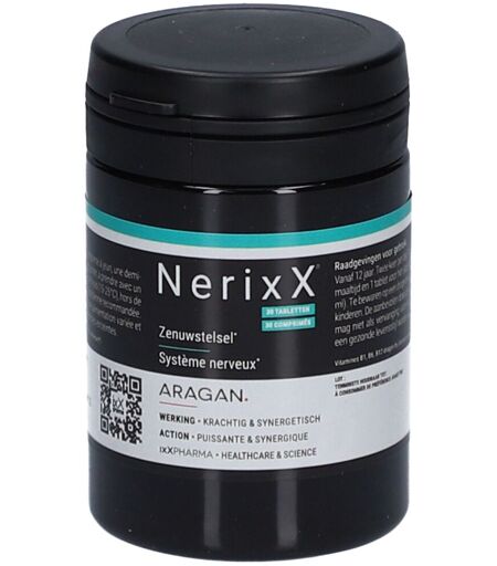 Complément alimentaire à utiliser dans le cadre d’une alimentation variée, équilibrée et d’un mode de vie sain.NERIXX® Système nerveux Vitamine B12, PEANERIXX® est un complément alimentaire formulé pour soutenir le fonctionnement normal du système nerveux. Sa composition associe du palmitoyléthanolamide (PEA) et de l’acide alpha-lipoïque, deux substances naturellement présentes dans l’organisme et étudiées dans la littérature scientifique, à des vitamines du groupe B essentielles.Il apporte :Vitamine B1, B6 et B12, qui contribuent au bon fonctionnement du système nerveux.Vitamines B6 et B12 actives (pyridoxal-5-phosphate et méthylcobalamine) hautement biodisponibles et directement utilisables par l’organisme.Une association spécifique avec le PEA et l’acide alpha-lipoïque, pour une formule complète et ciblée.NERIXX® peut être utilisé dans le cadre d’un apport nutritionnel adapté, notamment lors de besoins spécifiques liés au système nerveux périphérique ou en période de fatigue.Association exclusive de PEA et d'acide alpha-lipoïque au dosages des études scientifiquesVitamines sous forme actives et biodisponiblesLe plus haut dosage en acide alpha-lipoïqueIngrédientsPalmitoyléthanolamide ; acide alpha-lipoïque ; agent de charge: cellulose silicifiée ; anti-agglomérant: sels de magnésium d’acides gras ; stabilisant: mono-et diglycérides d’acides gras ; arôme: vanille ; vitamine B12 (méthylcobalamine) ; vitamine B1 et vitamine B6 (pyridoxal-5-phosphate).Données nutritionnellesPour 2 comprimés :PEA : 600 mgAcide alpha-lipoïque : 590 mgVitamine B1 : 3,3 mg (300% AR)Vitamine B6 : 1,4 mg (100% AR) (pyridoxal-5-phosphate)Vitamine B12 : 12,5 μg (500% AR) (méthylcobalamine)AR : apport de référenceConseils d'utilisation2 comprimés De préférence à jeun À partir de 12 ansPrécautions d'emploi Conserver dans un lieu sec et frais (15-25°C). Tenir hors de portée des jeunes enfants. Ne pas dépasser la dose recommandée. Déconseillé aux femmes enceintes.Poids net30 comprimésFabricantixX PHARMABorsbeeksebrug 342600 AnversBelgique ...