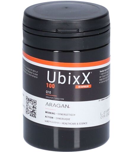 Complément alimentaire à utiliser dans le cadre d’une alimentation variée, équilibrée et d’un mode de vie sain.UBIXX 100® CoQ10 100 mg haut dosage Coenzyme Q10 énergie cellulaire & antioxydantUBIXX 100® apporte 100 mg de coenzyme Q10 sous forme d’ubiquinone, obtenue par fermentation naturelle. La coenzyme Q10 est une molécule présente dans toutes les cellules de l’organisme et impliquée dans les processus de production d’énergie cellulaire. La pureté de cette ubiquinone garantit une qualité optimale.Chaque capsule est associée à de l’huile de colza, source d’acides gras poly-insaturés, qui contribue à une meilleure assimilation de la coenzyme Q10 par l’organisme.Très haut dosage en 1 seule capsule : 100 mgUbiquinone : coenzyme Q10 sous sa forme oxydéeUbiquinone pure, produit par fermentationIngrédientsHuile de colza (Brassica napus) ; capsule (enrobage : gélatine ; stabilisant : glycérol, éthylvanilline) ; coenzyme Q10 ; émulsifiant : mono et diglycérides d’acides gras ; vitamine E.Données nutritionnellesPour 1 capsule :Coenzyme Q10 (ubiquinone) : 100 mgConseils d'utilisation1 capsule par jourPrécautions d'emploi Conserver dans un lieu sec et frais (15-25°C). Tenir hors de portée des jeunes enfants. Ne pas dépasser la dose recommandée.Poids net30 gélulesFabricantixX PHARMABorsbeeksebrug 342600 AnversBelgique ...