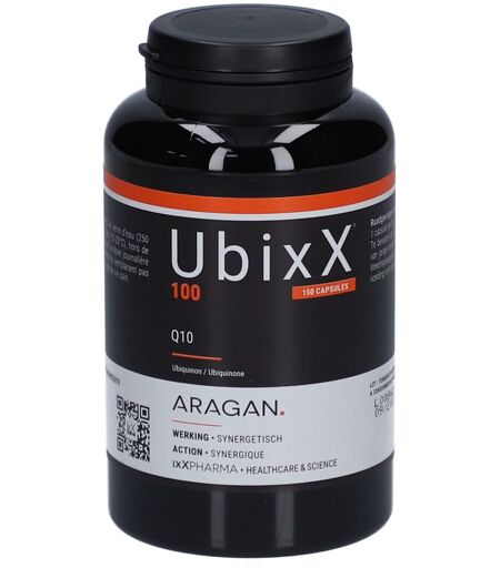 Complément alimentaire à utiliser dans le cadre d’une alimentation variée, équilibrée et d’un mode de vie sain.UBIXX 100® CoQ10 100 mg haut dosage Coenzyme Q10 énergie cellulaire & antioxydantUBIXX 100® apporte 100 mg de coenzyme Q10 sous forme d’ubiquinone, obtenue par fermentation naturelle. La coenzyme Q10 est une molécule présente dans toutes les cellules de l’organisme et impliquée dans les processus de production d’énergie cellulaire. La pureté de cette ubiquinone garantit une qualité optimale.Chaque capsule est associée à de l’huile de colza, source d’acides gras poly-insaturés, qui contribue à une meilleure assimilation de la coenzyme Q10 par l’organisme.Très haut dosage en 1 seule capsule : 100 mgUbiquinone : coenzyme Q10 sous sa forme oxydéeUbiquinone pure, produit par fermentationIngrédientsHuile de colza (Brassica napus) ; capsule (enrobage : gélatine ; stabilisant : glycérol, éthylvanilline) ; coenzyme Q10 ; émulsifiant : mono et diglycérides d’acides gras ; vitamine E.Données nutritionnellesPour 1 capsule :Coenzyme Q10 (ubiquinone) : 100 mgConseils d'utilisation1 capsule par jourPrécautions d'emploi Conserver dans un lieu sec et frais (15-25°C). Tenir hors de portée des jeunes enfants. Ne pas dépasser la dose recommandée.Poids net150 capsulesFabricantixX PHARMABorsbeeksebrug 342600 AnversBelgique ...