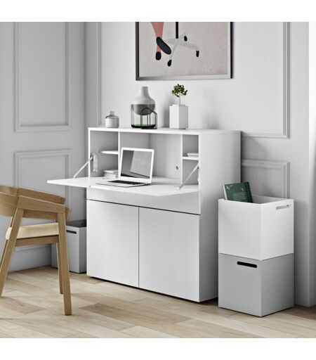 Ce bureau avec porte rabattable blanc mat JUNE se fond dans le décor de votre salon ou de votre chambre à coucher. Il s'agit d'un mobilier personnel, servant à la fois de rangement pour divers objets du quotidien et de table de travail dans votre domicile. Son corps volumineux est sectionné en une porte rabattable qui offre un plateau rectangulaire en position ouverte, et en deux portes battantes sur sa partie inférieure. Le blanc mat sur ce bureau s'associe à merveille avec le style décoratif de votre choix. L'utilisation des panneaux agglomérés souligne la qualité de sa fabrication. Couleur : blanc mat Matière : panneaux agglomérés Dimensions (Lxlxh) : 110 x 42 x 109 cm Poids maximum supporté par le plateau du bureau : 5 kg Poids maximum supporté par le meuble: 50 kg Poids : 65 kg Livré prêt à monter Cet article existe également dans d'autres coloris ...