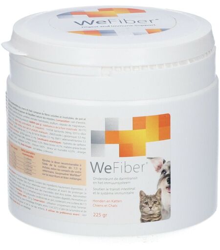 WeFiber est une poudre appétente et un aliment complémentaire pour chiens et chats composé de fibres solubles et insolubles, de pré- et probiotiques, pour aider à maintenir l'équilibre naturel des intestins. Spécialement conçu pour réguler le péristaltisme intestinal et prévenir l'impact des glandes anales. Soutien l'immunité Soutient le système digestif Soutient les glandes anales Goût appétissant Cliniquement prouvé Coneils d'utilisation: < 10 kg : 0,5 cuillère par jour 10-20 kg : 1 cuillère par jour 21-30 kg : 1,5 cuillères par jour 31-40 kg : 2 cuillères par jour > 40 kg : 3 cuillères par jour Ajouter la quantité recommandée à l'aide de la cuillère de 7,5 g fournie, selon les conseils d'un vétérinaire. Saupoudrer WeFiber sur les aliments et mélanger. Convient aux chiens et aux chats. Ajuster en fonction du poids corporel de l'animal. Donner WeFiber pendant une période de 3 à 12 semaines jusqu'à ce que les problèmes digestifs cessent. Toujours fournir de l'eau fraîche à l'animal. Précautions d'emploi: Garder hors de portée des enfants. Conserver au frais et au sec, ainsi qu’à l’abri de la lumière. Composition: Psyllium, son d'avoine, produits de levure (mannan-oligosaccharides, nucléotides et bêta-glucanes), glutamine, Enterecocos faecium, protéines animales hydrolysées, stéarate de magnésium, chlorure de sodium, chlorure de potassium, bentonite, minéraux (zinc, fer) et arômes naturels. Conditionnement: Boîte de 225 g ...
