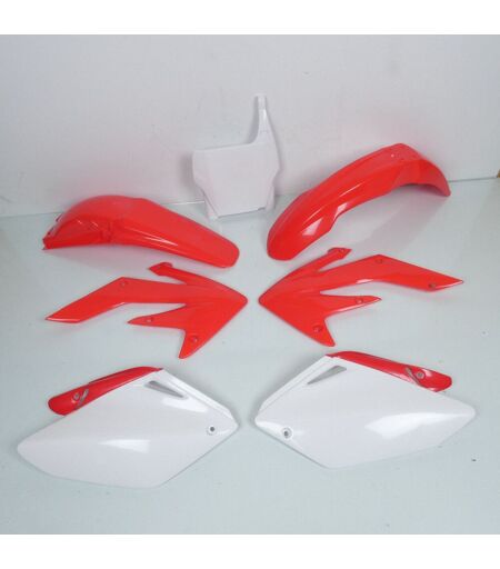 Kit carénage sept pièces neuf adaptable de marque Polisport coloris rouge et blanc. Ce kit carrosserie comprend : - La plaque phare (blanche) - Le garde boue avant (rouge) - Le garde boue arrière (rouge) - Une paire d'écope de réservoir (rouge) - Une paire de cache latéraux arrières (blanc et rouge) Vendu nu à l'unité. Livré conforme à la photo. ...