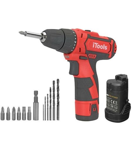 Perceuse Visseuse sans fil 12V ITOOLS à batterie Lithium 1.5 Ah. Durée de charge de la batterie 1 heure Eclairage LED- Indicateur de charge -Fonction réversible. 6 Embouts de vissage + 6 Forêts + adaptateur inclus dans le pack. Diamètre max de forêt 10 mm - poids 1 kg Poids : 1.5 kg Dimensions : 300 x 220 mm Normes / Classifications : Certification CE Tension batterie (en Ah) : Batterie LITHIUM 1.5 AH Tension : 12 V Eclairage : Lampe intégrée Niveau sonore : 87 DB Temps de charge : 1 heure Diamètre max. de la mèche : 10 mm Fonction : Réversible Vitesse rotation perçage (en tour/min) : 0-1100 tr/min Accessoires inclus : 13 embouts vissage et perçage + Chargeur rapide 1h ...
