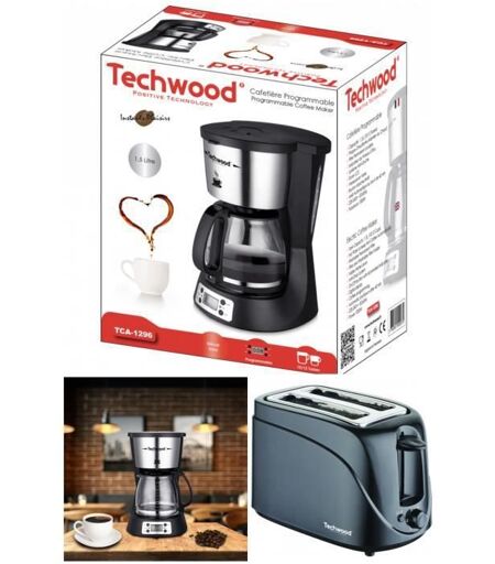 Techwood Cafetière Programmable Grise 1.5l 1000w + Grille Pain Noir 700w 2 Emplacements