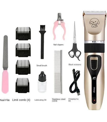 Specifications; Batterie incluse:Oui; Chimique Hign-concerné:Aucun; Est dispositif intelligent:Non; Numéro de Modèle:Haircut Trimmer Shaver Set; Source d'alimentation:accumulateur électrique; Temps de charge:3 heures; Tension:110-240; Type:Chiens; Type D'article:Taille-cheveux de chien; product name:Pet scissors; Blade material:Ceramic blade; Product Color:golden; Appearance material:ABS; Product size:188mm*41mm; Function 1:hair clipper; Function 2:pet items; Function 3:pet shop tudo para caes; Function 4:grooming; Function 5:pet clippers; Function 6:dog clippers; Function 7:pet grooming; Function 8:dog trimmer; Function 9:dog grooming; Function 10:dog haircut machine; Function 11:dog hair remover machine; Function 12:Quiet Hair Clippers Set; Function 13:for Dogs Cats Pets; Function 14:Low Noise Rechargeable Cordless Electric; Spécification :; Type: tondeuse professionnelle pour animaux de compagnie; Puissance: 10W 5V; Tension: 5V; Batterie : batterie Li-ion 1500 mAh.; Temps de charge : environ 3-4 heures; Temps d'utilisation : plus de 120 minutes; Matériau du corps : Tout en métal; Contenu du paquet :; 1 * tondeuse à cheveux; 1 * huile lubrifiante; 4 * peignes de limite (3 mm/6 mm/10 mm/13 mm); 1 * brosse de nettoyage; 1 * câble USB; 1 * manuel d'utilisation; ¿ Lames de précision adaptées à tous les types de poils; ¿ Moteur silencieux pour garder les animaux calmes; ¿ Têtes de lame amovibles faciles à nettoyer; ¿ Ajouter des accessoires très pratiques; ..La livraison depuis la France est prévue dans 5 jours ouvrés, n'hésitez pas à passer votre commande ...