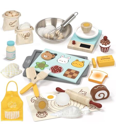 JOUETS DE PÂTISSERIE RÉALISTES - L'accessoire cuisine enfant comprend 23 pièces au total, dont un batteur à ?ufs, un bassin en acier inoxydable, un sac de farine, un sac de sucre blanc, un rouleau à pâtisserie, une balance, un tablier, du beurre, du lait, des ?ufs, un cupcake, un rouleau de gâteau, du pain grillé. , moule à biscuits, etc.¿JEU DE RÔLE ÉDUCATIF - Ce jouet de cuisine en bois enfant peut familiariser les enfants avec le processus de cuisson et apprendre à remuer, rouler, couper, cuire et d'autres actions ! Il aide les enfants à apprendre la distinction et la correspondance des formes des aliments et améliore la coordination ?il-main et la motricité fine. Laissez vos enfants devenir de petits chefs pâtissiers !DESIGN CRÉATIF - Lehoo Castle accessoires cuisine enfant fournit des éléments de design colorés et intéressants pour inspirer la créativité des enfants. Par exemple, des biscuits de différentes formes et de riches accessoires de pâtisserie sont disponibles, permettant aux enfants d'utiliser leur imagination pendant le processus de cuisson et de créer leurs propres délicieuses pâtisseries.HAUTE QUALITÉ ET SÉCURITÉ - Nos jouets de pâtisserie sont fabriqués à partir de bois naturel de haute qualité, d'une peinture à base d'eau respectueuse de l'environnement, d'une surface non toxique, sans BAP, lisse et sans bavure. Les aliments découpables sont conçus avec des attaches en nylon, qui peuvent être coupées et collées à plusieurs reprises et sont suffisamment solides pour les empêcher de tomber.¿EXCELLENT CADEAU POUR LES ENFANTS DE 3 ANS ET PLUS - L'accessoire de cuisine Lehoo Castle pour enfant est un cadeau idéal pour les enfants âgés de 3 ans et plus, adapté pour un anniversaire/la fête des enfants/Halloween/Noël/Pâques ou toute autre oc n.AttentionNe convient pas aux enfants de moins de 3 ans. À utiliser sous la surveillance d'un adulte.La livraison depuis la France est prévue dans 5 jours ouvrés, n'hésitez pas à passer votre commande ...