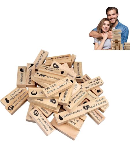 Qualité Premium et SécuritéFabriqué en hêtre avec des blocs de 7,2x2,4cm spécialement calibrés pour une stabilité optimale. Surface triple polie sans échardesUne expérience à 100 %Utilisez ce jeu pour raviver la flamme dans votre relation ! Un processus stimulant chaque fois que vous retirez une pièce, vous découvrez une consigne ou une question audacieuse qui vous permettra de renforcer votre relation.Stratégie Passionnée et CommunicationAlliez concentration tactique et audace romantique Ce jeu développe une synergie unique entre partenaires, où chaque succès renforce la confiance mutuelle et chaque échec devient prétexte à des rires complices.Design Français48 blocs en bois de hêtre avec des mes s coquins en français, pour pimenter votre vie. Chaque pièce vous propose un défi. Idéal pour les couples, pour renforcer leur relation.Un cadeau inoubliableLe cadeau ultime pour votre amoureux francophone ! Idéal pour les oc ns spéciales (Saint-Valentin, anniversaire de mariage) ou pour transformer une simple soirée en jeu d'aventure - une preuve tangible..La livraison depuis la France est prévue dans 5 jours ouvrés, n'hésitez pas à passer votre commande ...
