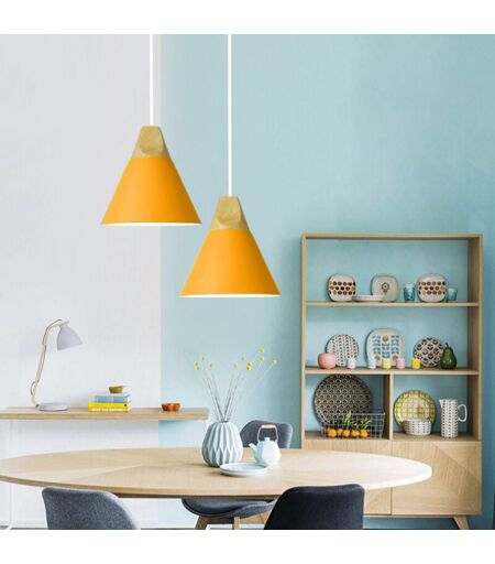Wottes - Lot de 2 Lustre Suspension Moderne Plafonnier Luminaire en Métal et Bois Lampe à Suspension Réglable Jaune Banane Ø22CM
