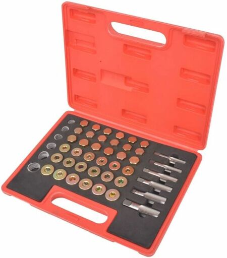 Kit complet pour la réparation des filetages des bouchons de vidange Six tailles populaires (M13 - M22) conviennent à presque toutes les applications Conception de la plus haute qualité pour une longue durée d'utilisation dans les ateliers quotidiens Livraison dans une mallette moulée par soufflage La livraison comprend : 6 x taraud en HSS (acier rapide) 4341 : M 13 x 1,25 / M 13 x 1,5 / M 15 x 1,5 / M 17 x 1,5 / M 20 x 1,5 / M 22 x 1,5 (6 tailles, 1 pièce pour chaque) 36 x bouchon de vidange d'huile / bouchon de carter en 45CR (6 tailles, 6 pièces pour chaque) 6 x rondelle en aluminium / anneau d'étanchéité ...