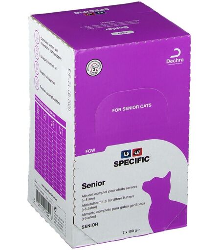 SPECIFIC® Senior pour chats Aliment complet pour chats âgés (>8 ans). SPECIFIC® Senior est un aliment complet équilibré pour chats âgés, qui tient compte de l'évolution des besoins nutritionnels des chats avec l'âge. La composition minérale et le pH de l'urine favorisent le fonctionnement des reins et des voies urinaires inférieures. La nourriture couvre tous les besoins nutritionnels des chats âgés et contribue à leur santé. Ne contient pas de colorants ou d'arômes artificiels ajoutés. Conseil d'alimentation Poids Sous-pondération Normale Surpoids kg g g g 1 65 50 40 2 105 80 65 3 135 105 80 4 165 125 100 5 195 145 115 6 220 165 130 7 240 180 145 8 265 200 160 9 285 215 170 10 305 230 185 11 325 245 195 12 345 260 210 S'il est nécessaire de maintenir ou d'atteindre le poids corporel idéal, veuillez ajuster la quantité de nourriture en conséquence. Ce montant peut être réparti entre deux repas ou plus par jour. Offrir les aliments à la température de la pièce. Composition Porc, huile de poisson, poisson, huile de tournesol, poudre d'oeuf, minéraux, vitamines et oligo-éléments, maïs, graines de plantago (graines de psyllium) (0,3%), cellulose en poudre, dextrose, xylose. Additifs (kg) Additifs nutritionnels : Cuivre 1,2 mg (chélate de glycine-cuivre, hydrate, solide), manganèse 2,2 mg (chélate de glycine-manganèse, hydrate), iode 0,7 mg, (iodate de calcium anhydre), taurine 1,1 g, L-carnitine 40 mg. Composants analytiques : Énergie convertible 636 kJ/100 g (152 kcal/100 g), Protéine brute 10,4 %, Graisses brutes 12,0 %, Cellulose brute 0,3 %, Cendres brutes 1,8 % 1,8 Teneur en humidité 72,9 %, Calcium 0.21%, Phorphor 0.17%, Magnésium 0,02 %, Sodium 0,09%, Acides gras oméga-3 1,1 %. ...