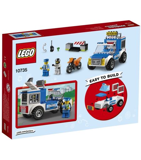 Rejoins la police de LEGO City et attrape le voleur, avec des modèles Faciles à construire comprenant un camion de police avec cellule, un barrage avec une porte qui bascule, plus une moto pour le voleur et un bijou. Les ensembles LEGO Juniors offrent une construction et des expériences de jeu adaptées aux enfants de 4 à 7 ans.. . - Inclut 2 figurines : un policier et un voleur.. - Comprend un camion de police et une moto.. - Le camion de police comprend une cellule à l'arrière qui s'ouvre par le haut avec de la place pour une figurine et un barrage routier avec une porte qui bascule.. - La moto inclut de la place pour une figurine.. - Installe le barrage routier pour arrêter le voleur et l'enfermer dans le camion.. - Les accessoires incluent un bijou, des menottes et un talkie-walkie.. - Avec des pièces plus grandes et un guide simple, ces modèles Faciles à construire permettent aux enfants de construire et de jouer rapidement.. - Cet ensemble offre une expérience de construction et de jeu adaptée aux enfants de 4 à 7 ans.. - Le camion de police mesure plus de 8 cm de haut, 13 cm de long et 6 cm de large.. - La moto mesure plus de 5 cm de haut, 6 cm de long et 3 cm de large. - Le barrage routier mesure plus de 6 cm de large, 3 cm de profondeur et moins de 2 cm de haut.. . 90 pièces. 2 minifigurines ...