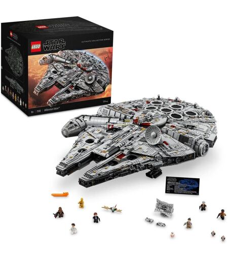 Voyage à travers la galaxie LEGO à bord de la toute dernière version du meilleur Millennium Falcon ! Ce nouveau modèle LEGO Star Wars Millennium Falcon est le plus grand et le plus détaillé jamais conçu. En réalité, avec ses 7 500 pièces, c'est tout simplement l'un des plus grands modèles LEGO ! Cette fantastique version LEGO de l'inoubliable cargo Corellien de Han Solo présente les moindres détails dont rêvent tous les fans de Star Wars, quel que soit leur âge : d'innombrables détails à l'extérieur, quatre canons laser supérieurs et inférieurs, des pieds d'atterrissage, une rampe d'embarquement qui s'abaisse et un cockpit avec toit amovible pouvant accueillir 4 figurines. Chacune des plaques de la coque peut être retirée pour découvrir les innombrables détails du compartiment principal, le compartiment arrière et le poste d'artillerie. Ce superbe modèle présente également des équipages et des radars interchangeables, ce qui permet aux fans d'opter pour les aventures LEGO Star Wars classiques avec Han, Leia, Chewbacca et C-3PO ou de plonger dans l'univers de l'Episode VII et VIII avec les anciens personnages Han, Rey, Finn et BB-8 ! - Inclut 4 figurines de l'équipage classique : Han Solo, Chewbacca, Princesse Leia et C-3PO. - Comprend également 3 figurines de l'Épisode VII/VIII : les anciens personnages Han Solo, Rey et Finn. - Figurines incluses : un droïde BB-8, ainsi qu'un mynock et 2 Porgs à construire. - L'extérieur du modèle présente des panneaux de coque amovibles et extrêmement détaillés, une rampe d'embarquement qui s'abaisse, un canon dissimulé, un cockpit pouvant accueillir 4 figurines avec toit amovible, des radars interchangeables (un rond et un rectangulaire), quatre canons laser supérieurs et inférieurs et 7 pieds d'atterrissage. - Le compartiment principal contient des sièges, l'holojeu Dejarik, un casque d'entraînement à distance au combat, un poste d'ingénierie avec un siège miniature pivotant et une entrée avec passage. - Le compartiment arrière se compose de la salle des machines avec un hyperdrive et une console, de 2 entrées, d'un compartiment dissimulé dans le sol, de 2 trappes de capsule de sauvetage, d'une console d'ingénierie et d'une échelle permettant d'accéder au poste d'artillerie. - Le poste d'artillerie présente un siège d'artilleur miniature et un panneau de coque amovible avec quatre canons laser entièrement rotatifs. Quatre autres canons laser sont également montés sur le dessous du modèle. - Ce modèle comprend 7 500 pièces. - Il inclut également une plaque d'information. - Avec un nouvel élément prévu pour octobre 2017 : le toit du cockpit. - Armes de l'équipage classique incluses : le pistolet de Han et l'arbalète (tirs de tenons) de Chewbacca. - Armes de l'équipage de l'Épisode VII/VIII incluses : le pistolet de Han, le petit fusil argenté de Rey et le pistolet de taille moyenne de Finn. - En échangeant des éléments et les membres de l'équipage, les fans peuvent passer de la version classique du Millennium... ...