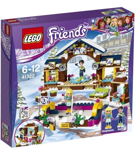 La patinoire de la station de ski LEGO® Friends comprend une patinoire extérieure avec des portes qui s'ouvrent, des buts de hockey et des sièges. La scène du chalet tourne et il est possible de louer un équipement de hockey et de patinage ou d'acheter une gourmandise au magasin de bretzel. Il y a même un arbre où vit un gentil lapin. Comprend deux minipoupées.. Comprend les minipoupées Stéphanie et Nate en tenue de patinage, plus une figurine de Moka le lapin.. Ages: 6-12 ans. Nombre dep ièces: 307 ...