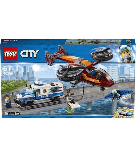Le diamant volé est sauvé grâce à l'ensemble La police et le vol de diamant. Les enfants peuvent surveiller les rues de LEGO City depuis le ciel avec l'ensemble génial La police et le vol de diamant 60209, comprenant un camion blindé de la police avec un toit qui s'ouvre, une brique lumineuse et sonore, une cellule de prison et un coffre-fort amovible. Cet ensemble de la police de LEGO City plein d'action inclut également un jetpack ailé, un hélicoptère de voleur avec des rotors qui tournent, une corde d'escalade en plastique et un cockpit qui s'ouvre, ainsi que 4 figurines. - Inclut 4 figurines LEGO City : 2 policiers et 2 voleurs. - Comprend une camionnette de police avec un toit qui s'ouvre, une brique lumineuse et sonore, une cellule de prison et un coffre-fort amovible, un hélicoptère de voleur avec 2 rotors qui tournent, une corde d'escalade en plastique pour voler le coffre-fort et un cockpit qui s'ouvre plus un jetpack ailé de la police. - Les accessoires comprennent un joyau, 3 casques avec des visières qui s'ouvrent, une casquette, une scie circulaire et des menottes. - Il est possible d'appuyer sur la brique sonore et lumineuse de la camionnette de la police pour dégager la route. - Les rotors de l'hélicoptère peuvent tourner pour faire semblant de planer sur la camionnette de la police. - La camionnette de la police mesure plus de 8 cm, 17 cm de long et 8 cm de large. - Le jetpack ailé mesure plus de 9 cm de long et 4 cm de large. - L'hélicoptère des voleurs mesure plus de 10 cm de haut, 21 cm de long et 20 cm de large. ...