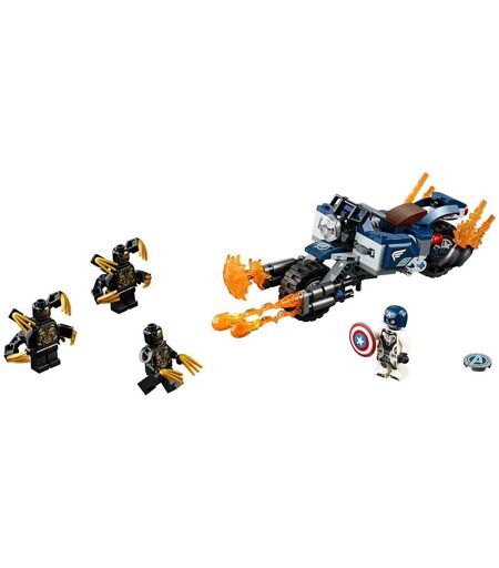 Captain America contre les Outriders ! Les enfants vont pouvoir lutter contre les Outriders avec la moto de Captain America dans LEGO Marvel Avengers 76123 Captain America et l'attaque des Outriders. Cet ensemble comprend: la moto à construire, un cockpit pour figurine, 2 boucliers de Captain America, 2 fusils amovibles qui ne tirent pas, des points d'attache pour figurines et un support de moto rabattable. Cet ensemble de construction pour les enfants contient 4 personnages Marvel dont une figurine de Captain America et une décoration de costume Avengers pour recréer des scènes passionnantes des films Marvel Avengers. - Cet ensemble Captain America comprend 4 figurines de l'univers Marvel : Captain America et 3 Outriders. - La moto de Captain America comprend un cockpit pour figurine, 2 boucliers tireurs de Captain America, une roue avant avec des fusils amovibles qui ne tirent pas, des points d'attache pour figurines, un support de vélo rabattable, un phare et une flamme de pot d'échappement. - Les fusils se détachent et se mettent dans les mains de Captain America prêt pour la bataille et un jeu imaginatif. - Cet ensemble de jeu de super héros comprend un casque de Captain America et une décoration de costume de l'équipe Avengers. - Les enfants peuvent récréer l'action palpitante des films Marvel Avengers avec ce jouet de construction LEGO. - Le véhicule de Captain America mesure plus de 7 cm de haut, 21 cm de long et 7 cm de large. ...