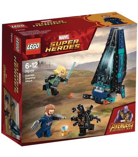 Les Avengers défendent Wakanda contre l'attaque des Outriders ! Captain America et la Veuve Noire se lancent dans la bataille contre les Outriders pour sauver Wakanda avec cet ensemble d'action LEGO Marvel Super Heroes 76101 L'attaque du vaisseau par les Outriders ! - Inclut 4 figurines : Captain America, la Veuve noire et 2 Outriders. - Le vaisseau est équipé d'un cockpit qui s'ouvre et peut accueillir 2 figurines, d'un élément représentant la Gemme de l'infini posé sur un support, d'ailes qui se replient et de 2 fusils à tenons - Les armes incluent les 2 boucliers wakandais de Captain America et les 2 bâtons de la Veuve Noire. - Les nouvelles figurines d'Outriders (nouveauté de mars 2018) ont 6 bras chacune. - Les enfants pourront recréer des scènes palpitantes du film Marvel Avengers: Infinity War. - Le vaisseau mesure plus de 12 cm de haut, 7 cm de long et 6 cm de large, et plus de 4 cm de haut, 19 cm de long et 23 cm de large avec les côtés repliés. ...