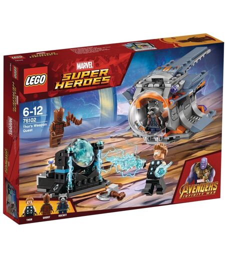 Rocket, Groot et Thor partent à la recherche de l'arme ultime : Le marteau de Thor ! Thor, Rocket et Groot partent en mission avec l'ensemble LEGO Marvel Super Heroes 76102 À la recherche du marteau de Thor. Ce jouet de super-héros inclut une capsule d'évasion dotée d'un cockpit qui s'ouvre avec de la place pour accueillir 3 figurines et 2 fusils à tenons, ainsi qu'une station spatiale avec une source d'énergie cosmique, une arme et des fonctionnalités, un élément représentant la Gemme de l'infini et son support, 3 figurines et 10 éléments représentant des explosions de puissance. - Inclut 3 figurines : Thor, Rocket et Groot (version adolescent, nouveauté de mars 2018). - La capsule d'évasion inclut un cockpit qui s'ouvre, un toit amovible et 2 fusils à tenons. - Les pare-brise avant et arrière du cockpit s'ouvrent et le toit se soulève pour placer 3 figurines à l'intérieur. - La station spatiale inclut une source d'énergie cosmique, 2 spirales d'énergie, une fonction de révélation de l'arme et un élément représentant la Gemme de l'infini ainsi que son support. - Inclut le fusil de Rocket et l'extension de bras de Groot. - Inclut 10 éléments assortis bleus translucides représentant des explosions de puissance, pour te permettre de personnaliser tes constructions et tes figurines. - La capsule d'évasion peut être connectée au vaisseau des gardiens de l'ensemble 76107 Le combat ultime de Thanos. - Les enfants pourront recréer des scènes palpitantes du film Marvel Avengers: Infinity War. - La capsule d'évasion mesure plus de 7 cm de haut, 13 cm de long et 11 cm de large. - La station spatiale mesure plus de 5 cm de haut, 7 cm de large et 8 cm de profondeur. ...