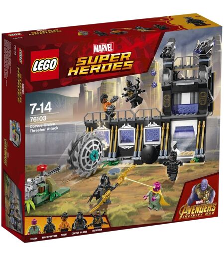 Repousse l'attaque du Thresher de Corvus Glaive au mur wakandais ! Mets en scène une bataille épique au mur wakandais qui oppose Vision, Shuri et la Panthère noire contre Corvus Glaive et un Outrider avec cet ensemble LEGO Marvel Super Heroes 76103 L'attaque du Thresher de Corvus Glaive. Le mur présente une porte qui s'ouvre à l'aide d'un levier, une tour avec deux tourelles à tenons rotatives, un lanceur de disques dissimulé, un laboratoire wakandais qui se renverse et l'élément représentant la Gemme de l'infini. Les ennemis attaquent avec un Thresher : lance-le contre le mur et vise bien pour parvenir à renverser le laboratoire. Ce jouet de super-héros inclut aussi 5 figurines. - Inclut 5 figurines : Vision, Shuri, la Panthère noire, Corvus Glaive et un Outrider. - Le mur wakandais présente une porte qui s'ouvre à l'aide d'un levier, une tour dotée de 2 tourelles à tenons rotatives, un lanceur de disques dissimulé, une section à charnières, un laboratoire avec un siège pouvant accueillir une figurine, un bureau avec 2 écrans d'ordinateur, une fonction de basculement et un élément représentant la Gemme de l'infini. - Inclut également un Thresher et son lanceur, équipés d'éléments de déclenchement et de camouflage. - Vise le mur avec le Thresher pour renverser le laboratoire. - Les armes incluent les 2 gants de Shuri et le bâton de Corvus Glaive. - La figurine d'Outrider (nouveauté de mars 2018) a 6 bras. - Associe plusieurs ensembles pour élargir le mur wakandais. - Les enfants pourront recréer des scènes palpitantes du film Marvel Avengers: Infinity War. - Le mur wakandais mesure plus de 20 cm de haut, 25 cm de large et 9 cm de profondeur. - Le lanceur du Thresher mesure plus de 5 cm de haut, 8 cm de large et 12 cm de profondeur. - Le Thresher mesure plus de 7 cm de haut, 7 cm de long et 4 cm de large. ...