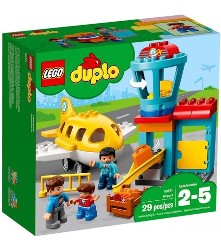C'est l'heure des vacances à l'Aéroport LEGO DUPLO ! Rejouez des scènes de la vie réelle dans la ville LEGO DUPLO : un monde reconnaissable avec des figurines DUPLO modernes. Aidez votre jeune pilote à se préparer au décollage à l'aéroport DUPLO ! Pour les enfants en âge préscolaire, rien de plus facile que de construire la porte d'embarquement, le tapis à bagages et la tour de contrôle rotative avec ce jouet épatant destiné aux enfants âgés de 2 à 5 ans. Les tout-petits adoreront aider la pilote à faire monter tous ses passagers à bord de l'avion à construire et à s'envoler dans les airs ! Inclut 3 figurines DUPLO. - Inclut 3 figurines LEGO DUPLO : un pilote, un papa et son enfant. - Comprend un aéroport avec un tapis à bagages, une porte d'embarquement et la tour de contrôle aérien rotative, plus un avion à construire avec des roues. - Les accessoires incluent une valise et une brique représentant un paquet-cadeau. - Rendez-vous à l'aéroport pour enregistrer vos bagages et les déposer sur le tapis à bagages. - Aidez la pilote à effectuer les contrôles de sécurité de son avion avant de quitter l'aéroport. - Montez dans la tour de contrôle et donnez le signal pour le décollage ! - Utilisez les personnages modernes, les accessoires et les briques décorées pour jouer à des jeux de rôle à propos de ce qui se passe à l'aéroport avant le premier voyage en avion de votre enfant grâce à ce jouet polyvalent. - Aidez votre enfant à maîtriser des compétences de construction de base avec ce modèle facile à construire. - Ce jouet épatant destiné aux enfants de 2 à 5 ans est un cadeau idéal. - Les produits LEGO DUPLO sont amusants et sûrs pour les jeunes enfants. - L'aéroport mesure plus de 22 cm de haut, 14 cm de large et 11 cm de profondeur. - L'avion mesure plus de 9 cm de haut, 18 cm de long et 17 cm de large. ...