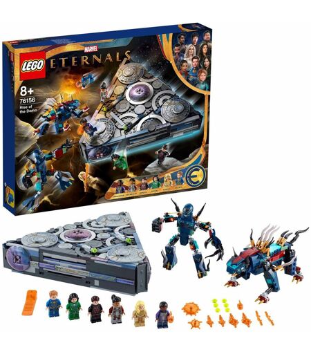 Avec le set LEGO Marvel L'ascension du Domo (76156), les enfants explorent l'intérieur du vaisseau des Éternels, puis reconstituent la bataille finale avec 6 super-héros et 2 terribles Déviants. Un vaisseau de combat à construire Ce set incluant un vaisseau de guerre va faire le bonheur des enfants, qui se joignent aux 6 Éternels - Makkari, Ikaris, Thena, Circé, Druig et Phastos - pour explorer leur vaisseau. Les 3 côtés s'ouvrent pour accéder au cockpit, à la salle d'armes, au laboratoire et plus encore. Mais quand l'abominable chef des Déviants arrive avec son complice, les enfants doivent utiliser le vaisseau pour les vaincre. Les fans de figurines seront comblés, car ce set LEGO est le seul à inclure Druig et Phastos ! Sets inspirés du film Eternals de Marvel Studios - Superbes jouets sur le thème des super-héros Les jouets LEGO Marvel Eternals et leurs incroyables figurines mêlent jeu, action et imagination, et constituent de beaux cadeaux de Noël ou d'anniversaire. - Le jouet de construction LEGO Marvel L'ascension du Domo (76156) fait entrer les enfants dans le vaisseau spatial des Éternels, puis leur fait vivre des batailles sans fin avec des figurines de super-héros et des Déviants. - Inclut 6 figurines - Makkari, Ikaris, Thena, Circé et, en exclusivité, Druig et Phastos -, 2 Déviants débordant d'action, dont Kro le seigneur Déviant, un vaisseau spatial, des armes et des accessoires. - Les enfants peuvent faire appel à tous leurs talents de super-héros dans la bataille finale qui oppose les Éternels aux Déviants. Le vaisseau spatial des Éternels, avec son intérieur détaillé, transporte le jeu imaginatif hors de ce monde ! - À la recherche d'un nouveau jouet sur le thème des super-héros ? Ce set LEGO Marvel Eternals, qui inclut 6 figurines et 2 Déviants débordant d'action, constitue un beau cadeau de Noël ou d'anniversaire pour les enfants de 8 ans et plus. - Avec le vaisseau spatial des Éternels qui mesure plus de 22 cm de long, le set LEGO Marvel Eternals L'ascension du Domo permet aux enfants de vivre des aventures épiques de super-héros, et sera du plus bel effet une fois exposé dans une chambre. - Ce jouet facile à construire s'accompagne d'instructions simples et claires, qui permettent aux enfants de construire, jouer et s'amuser sans attendre avec leur set sur le thème des super-héros Éternels. - Les jouets LEGO Marvel Eternals placent l'action et l'aventure du film entre les mains des enfants ! Avec des super-héros fascinants à collectionner, les aventures imaginatives et le jeu de rôle ne s'arrêtent jamais. - Les jeux de construction LEGO sont conformes aux normes les plus rigoureuses du secteur du jouet ils sont compatibles entre eux et peuvent être parfaitement assemblés et démontés, et cela depuis 1958. - Toutes les briques et pièces LEGO sont soumises à des tests de chute, de chaleur, d'écrasement et de torsion, puis analysée afin de s'assurer que les jouets de construction sont conformes aux normes de sécurité et de qualité... ...