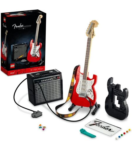 Créez votre guitare Fender Stratocaster des années 1970 et son ampli 65 Princeton Reverb avec ce set LEGO Ideas (21329). Rendez hommage aux musiciens légendaires qui ont joué sur la Stratocaster en recréant ses lignes mythiques et ses détails réalistes dont le vibrato mobile, le sélecteur de micro et les chevilles. Vous pourrez accéder à la carte mère, à la réverbe, au haut-parleur et à d'autres détails grâce aux panneaux amovibles de l'ampli, et le raccorder à la guitare et à la pédale d'effet avec les câbles. Une superbe décoration Ce set inclut des briques pour construire la guitare en rouge ou en noir, des médiators de 4 couleurs, un support repliable pour exposer l'instrument. et un autocollant orné du logo de la Fender en briques LEGO à coller où vous voulez. Un bel objet collector Ce set fait partie d'une collection de kits LEGO pour adultes. Une très belle idée de cadeau pour les guitaristes, les fans de Fender, les amateurs de musique et les passionnés de briques LEGO. - Recréez une guitare légendaire avec cette réplique LEGO Ideas magnifiquement détaillée (21329) d'une guitare Fender Stratocaster 1970 et d'un amplificateur Fender 65 Princeton Reverb à construire et exposer. - La guitare comprend un vibrato mobile, un sélecteur de micro, des chevilles et six cordes et s'accompagne d'autocollants au logo de Fender et d'une sangle en tissu. Les briques incluses permettent de construire le modèle en rouge ou en noir. - L'ampli est doté de panneaux amovibles pour accéder à la carte mère, à la réverbe, au haut-parleur et aux autres détails ainsi que de câbles en caoutchouc pour le raccorder à la guitare et à la pédale à effet. Fourni avec des autocollants. - Inclut un support pliant pour exposer la guitare, des médiators de 4 couleurs ainsi qu'un autocollant orné du logo Fender en briques LEGO à coller sur votre vraie guitare, votre ampli ou partout où vous voulez. - La guitare mesure plus de 36 cm de long, 11 cm de large et 3 cm de profondeur. Ce modèle d'exposition LEGO constitue un formidable cadeau pour les guitaristes, les amateurs de musique et les fans de la Fender Stratocaster. - Réalisez cette construction en solo ou avec des amis et des proches pour leur transmettre votre passion pour cette guitare mythique, la musique ou les briques LEGO. - Ce set de 1 079 pièces est accompagné d'un livret qui retrace l'histoire de la guitare Fender Stratocaster, présente le designer passionné créateur de ce set ainsi que les designers LEGO® et contient les instructions de montage étape par étape. - Ce fabuleux set de construction créé par un designer passionné et présenté au concours LEGO Ideas « Music to our Ears » a été élu par le comité d'étude LEGO Ideas parmi les 9 meilleures idées pour devenir le prochain produit LEGO Ideas. - Conformes aux normes les plus rigoureuses du secteur du jouet, les éléments LEGO s'assemblent simplement et solidement pour garantir une construction robuste, et cela depuis 1958. - Les briques et les pièces de... ...