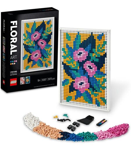 Le set Art floral LEGO Art (31207) d'inspiration botanique va éveiller votre créativité. Faites entrer chez vous une palette de couleurs et de possibilités et laissez votre imagination s'épanouir en créant votre propre motif. Plongez dans votre espace de détente et de sérénité en positionnant chaque pièce l'une après l'autre. Exprimez votre passion pour les fleurs et l'art. 1 tableau, 3 choix, une infinité de possibilités artistiques. Ouvrez la boîte et découvrez les nombreuses options créatives. Choisissez les fleurs et la palette de couleurs, puis concevez et créez votre oeuvre. Terminez-la par un cadre de briques blanches et exposez-la fièrement au mur ou sur une étagère. Qu'allez-vous créer ? Bienvenue dans votre zone de créativité avec les sets LEGO destinés aux adultes. Détendez-vous et construisez des oeuvres rendant hommage à la nature ou au monde de l'art, du spectacle, du voyage, du jeu, du sport, de la science, de la technologie, de la moto et de l'histoire. - Des fleurs partout ? Invitez la nature chez vous et célébrez ses couleurs en construisant le set Art Floral LEGO Art (31207), proposant 3 motifs floraux au choix ainsi qu'une infinité d'options de personnalisation - Conçu pour être exposé ? Ce projet-passion LEGO de 2 870 pièces inclut 6 plaques de construction, un cadre en briques, une palette de couleurs, un outil pour séparer les briques et 2 éléments de suspension - La passion du design ? Rendez hommage à votre amour pour les fleurs et les couleurs vives qui expriment vos passions, et créez une oeuvre d'art LEGO à exposer avec fierté où vous voulez - Explorez les couleurs ? Pénétrez dans un univers de relaxation et de sérénité proche du zen en créant une oeuvre florale dans la palette de couleurs de votre choix, en harmonie avec votre décoration intérieure - Le bonheur de créer ? Choisissez les couleurs de votre motif floral et du fond, puis changez-les au gré de vos envies. Ce tableau est votre touche personnelle pour embellir tout espace - À offrir en cadeau ? Ce set LEGO Art mesure plus de 40 cm de haut sur 27 cm de large. Il peut être offert en cadeau à toute personne (et vous en faites partie !) passionnée de fleurs ou de projets artistiques colorés - Guide illustré ? Les instructions de qualité vous guident tout au long du projet et vous inspirent pour organiser et mettre en valeur les superbes options de couleurs qui embelliront votre intérieur - Loisir créatif pour adultes ? Découvrez l'univers de la décoration intérieure avec les sets LEGO Art pour adultes. Immiscez-vous dans le monde des artistes et de la couleur, tout en vous adonnant à votre passion pour les loisirs créatifs - Excellente qualité ? Les pièces de construction LEGO répondent à des normes de qualité exigeantes. Elles sont compatibles entre elles et s'assemblent et se séparent toujours facilement, et ceci depuis 1958 - La sécurité avant tout ? Les pièces LEGO font l'objet de tests pour garantir la conformité de chaque set de construction LEGO Art aux... ...