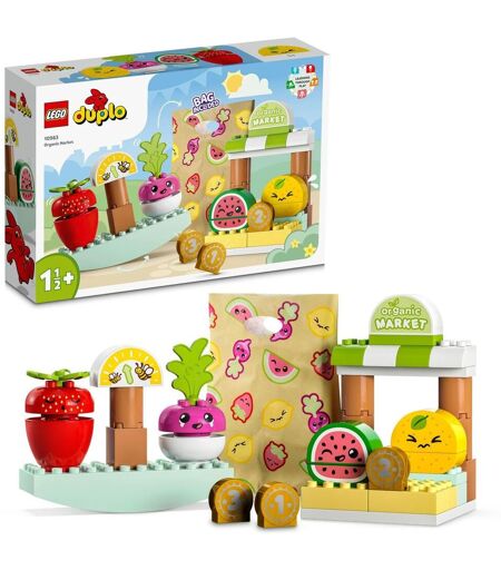 Avec Le marché bio LEGO DUPLO My First (10983), les enfants jouent à faire les courses. Ce joli marché fermier leur permet de recréer le monde réel, de peser les produits sur la balance, de payer avec les pièces et d'emporter leurs achats dans un joli sac en tissu. Des jeux éducatifs qui mettent l'accent sur le côté ludique. Les sets LEGO DUPLO sont conçus pour développer l'expression personnelle. Les enfants découvrent l'équilibre en empilant radis, fraise, citron et pastèque, et chaque aliment affiche une expression différente pour donner vie au jeu créatif ! Jeux éducatifs à manipuler pour les tout-petits. Les jouets LEGO DUPLO placent l'expression personnelle et l'apprentissage ludique entre les mains des tout-petits. Ce set favorise le jeu interactif entre enfants et adultes, dans le rôle du marchand qui vend ses fruits et légumes ou du client qui les achète. Les sets DUPLO permettent aux parents de partager de précieuses étapes d'éveil avec leurs enfants en construisant et jouant ensemble. - Un marché fermier pour les tout-petits - Avec Le marché bio LEGO DUPLO My First (10983), faire les courses devient un jeu amusant pour les jeunes constructeurs de 18 mois et plus - De nombreuses fonctionnalités pour un jeu infini - Inclut une pastèque, un citron, un radis et une fraise, chacun affichant une expression différente, ainsi qu'une balance pour peser les produits, 3 pièces et un sac en tissu - Jeu d'imagination pour les petits apprenants - Les tout-petits pèsent les aliments sur la balance, payent avec les pièces, puis emportent leurs achats dans le sac en tissu - Un cadeau dès 18 mois - Les adultes qui souhaitent partager de précieuses étapes d'éveil avec leurs tout-petits peuvent offrir ce jeu éducatif aux enfants qui aiment jouer à faire les courses - Dimensions - L'étal du marché mesure plus de 20 cm de haut, 15 cm de large et 15 cm de profondeur. La balance mesure plus de 16 cm de haut, 19 cm de large et 6 cm de profondeur - Cultiver l'imagination - Multipliez les options de jeu de construction sur le thème de la culture biologique avec les sets La carotte qui pousse (10981), Le tracteur des fruits et légumes (10982) et Le jardin bio (10984) - Instructions étape par étape - Des instructions illustrées faciles à suivre sont incluses dans la boîte et figurent également dans l'application LEGO Builder, pour accompagner ceux qui débutent dans la construction LEGO - Des jeux d'éveil pour apprendre en s'amusant - Ce set LEGO DUPLO aide les enfants d'âge préscolaire à développer leur motricité fine et à apprendre comment les plantes poussent en construisant et en jouant avec leurs parents et éducateurs - Qualité constante - Les sets de jeu LEGO DUPLO sont conformes aux normes industrielles les plus exigeantes. Ils sont faciles à saisir, assembler et séparer par les petites mains, et cela depuis 1969 - Sécurité assurée - Les briques et les pièces des jeux d'éveil LEGO DUPLO sont soumises à des tests de chute, de chaleur, d'écrasement et de... ...