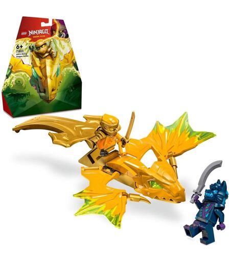 Les enfants dès 6 ans peuvent recréer leurs scènes préférées de la saison 2 de la série télévisée NINJAGO® Le soulèvement des dragons avec L'attaque du dragon rebelle d'Arin (71803). Ils vont adorer construire ce jouet d'action dragon LEGO NINJAGO, puis appuyer sur la queue dorée du dragon afin de les envoyer au combat. Constituant un beau cadeau, ce set de dragon inclut 2 minifigurines : Arin dragon rebelle avec un katana et un dragon sur lequel il peut s'envoler, et un Guerrier au masque de loup avec son sabre. Les enfants peuvent rejouer des combats épiques afin de remporter l'élément de pouvoir du dragon vert vif qui se trouve dans la bouche articulée du dragon jaune. La gamme de sets de construction LEGO NINJAGO inclut des robots, des véhicules et des temples qui encouragent les fans à inventer une foule d'histoires avec leurs héros (sets vendus séparément). L'appli LEGO Builder vous permet de vivre une aventure de construction simple et intuitive avec votre enfant. - Un dragon débordant d'action pour enfants - Les garçons et les filles dès 6 ans peuvent rejouer les combats de la saison 2 de la série télévisée NINJAGO Le soulèvement des dragons avec le dragon volant de L'attaque du dragon rebelle d'Arin - Un jouet d'action ninja - Les enfants peuvent placer Arin dragon rebelle sur le dos du dragon jaune et appuyer sur sa queue dorée pour les propulser dans les airs - 2 minifigurines LEGO NINJAGO - Ce set ninja inclut une minifigurine d'Arin armée d'un katana miniature pour mettre en scène des combats contre un Guerrier au masque de loup doté de son propre sabre - Élément de pouvoir du dragon vert vif - Ce fantastique dragon jaune tient un élément de pouvoir du dragon vert vif dans sa bouche - Cadeau ninja - Ce set LEGO NINJAGO, parfait pour construire et jouer, est un beau cadeau à offrir à un enfant en toute occasion - Des aventures extraordinaires avec les ninjas - Découvrez d'autres modèles LEGO NINJAGO (sets vendus séparément) pour organiser des courses encore plus passionnantes - Tout un univers de jouets ninjas pour enfants - Les robots, véhicules et temples des sets LEGO NINJAGO permettent aux enfants de s'évader dans un univers fantastique débordant d'aventures aux côtés de leurs héros ninjas - Dimensions - Ce set ninja de 27 pièces inclut un dragon qui mesure plus de 2 cm de haut, 18 cm de long et 18 cm de large ...