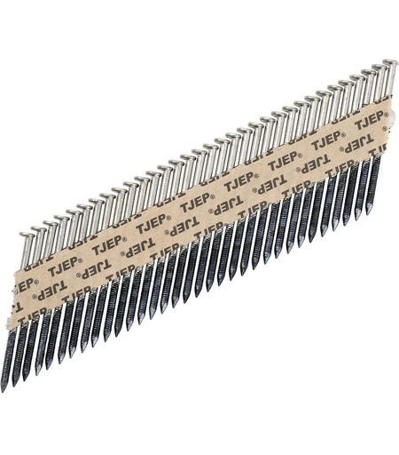 1200 CLOUS EN BANDE 34° 3.1 x 63 Crantés Inox A4 tête ronde plate Clous compatibles avec les cloueurs à charpente pneumatiques,à gaz ou à batterie,inclinaison 33° ou 34°.Livrés sans gaz (disponible). Important: Pour la plupart des cloueurs à gaz ou à batterie il est fortement conseillé de choisir des clous lisses pour les grandes longueurs,en particulier pour les 90mm. Liste partielle des cloueurs compatibles avec ce type de pointes,longueur admissible de votre cloueur à vérifier: Alsafix TRAK-IT W3-34D Bostitch F33PT-E Dewalt D51825 Max GS690CH Paslode F350S Senco SN3 Alsafix D90G1 Bostitch F33PTSM-E Dewalt D51856 Max SN890CH/34 Rocafix PN 50-90D Senco SN901 Alsafix - D 38/100 P1 Comrex 3490 Haubold N 90 PA Max 90CH 34 Senco A900FN Senco S900FN Sofragraf SN325 Alsafix - D 38/100 P1 Deuzer RHF9034 Hilti GX90-WF Max SN883 CH 34 Senco FramePro 601 Silverline 282400 Alasafix D90P1 Hitachi NR83AA Montana GSN 34-90 Senco FramePro-650 Wurth DSN 5090 BEA D100-934 Hitachi NR90AD Paslode F400 ...