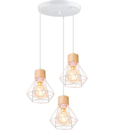 Axhup - Rétro Lustre Suspension Cage Diamant Fer Luminaire 3 Lumières Design en Bois Blanc