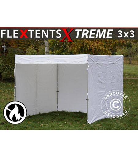 Spécifications produit Largeur: 3,00 m. Longueur: 3,00 m. Hauteur des côtés: 2,10-2,40 m. Matériel de toit: 300Dx300D polyester avec revêtement PVC 300g/m² Parties latérales: 300Dx300D polyester avec côté arrière en PVC 300g/m² Tubes / raccords: Aluminium Diamètre des tiges: 50x50x1,8mm + 35x35x1,8mm + 35x18x1,8mm Personnes: 5-9 Étanche: 100% Étanche Dimensions plié: 1,52x0,31x0,31 m. Couleur: Blanc Sécurité incendie: DIN 4102-1 B1 Certificat UV: Résistant à l'influence des rayons UV Inclus: Cadre, 1 toile de toit, Les parois latérales: 3 standard, 1 zip. Piquets: 25 cm, sac à roulettes. Conçue pour les salons et foires en intérieur 4 parois incluses Montage facile en 60 secondes Qualité professionnelle Design fonctionnel Hauteur ajustable Facile à stocker et à transporter Conseils et services personnalisés Impression sur toile disponible Incl. sac de transport avec roulettes pratique (159,5x31,5x31,5 cm) Enlever la partie supérieure du poteau de toit avant la mise en place FleXtents ...
