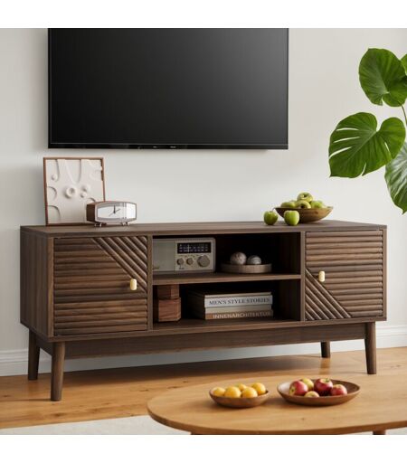Meuble TV effet bois vintage marron avec 2 portes et 2 niches 110x40x48cm Ce meuble TV allie élégance et fonctionnalité pour créer un centre de divertissement à la fois pratique et esthétique. Son design unique, mêlant les styles Mid-Century et Farmhouse, est mis en valeur par des portes de placard au motif en relief et de jolies poignées métalliques. Avec de nombreux espaces de rangement pour tous vos appareils multimédias et un système de gestion des câbles intelligent, il est conçu pour garder votre salon organisé et sans encombrement. Rangement Généreux : Conçu pour les téléviseurs jusqu'à 45 pouces, il offre deux placards latéraux et des étagères ouvertes pour ranger et organiser vos consoles, DVD et accessoires. Gestion des Câbles Intelligente : Un trou prédécoupé à l'arrière permet de faire passer vos câbles en toute discrétion pour maintenir votre espace propre et bien rangé. Portes au Design Unique : Les portes sont ornées d'un motif strié distinctif et équipées de charnières ...