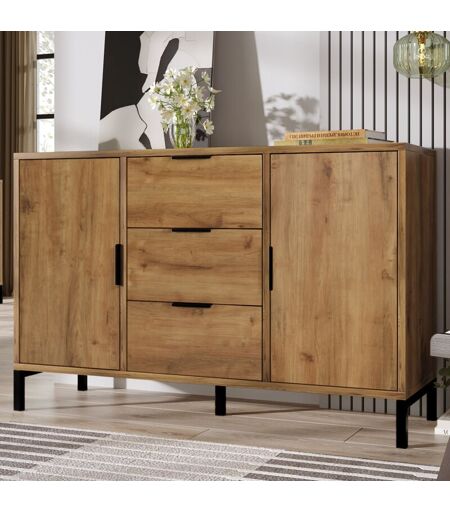 Urban Meuble - Buffet effet bois chêne foncé style industriel 2 portes 3 tiroirs 120x40x76cm omnaers