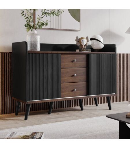 Buffet élégant vintage effet bois noyer et noir avec 2 portes coulissantes VEKAID BLACK Transformez votre maison en un sanctuaire élégant avec notre buffet à trois tiroirs à grain exquis. Ce buffet n'est pas seulement un meuble, c'est une déclaration de style, de fonctionnalité et de sophistication. Le mélange parfait de style et de fonctionnalité : Imaginez entrer dans votre salon, salle à manger ou couloir et être accueilli par les lignes épurées et les tons de bois modernes de ce superbe buffet. Son esthétique raffinée rehausse sans effort n'importe quel intérieur, ce qui en fait le complément idéal aux styles de décoration contemporains et classiques. Grand espace de rangement, design élégant : Ouvrez les superbes portes rayées de chaque côté pour révéler des intérieurs spacieux équipés d'étagères réglables. Que vous rangiez votre porcelaine fine, vos livres précieux ou vos essentiels du quotidien, ce buffet s'adapte facilement à vos besoins. Les trois tiroirs centraux s'ouvrent ...