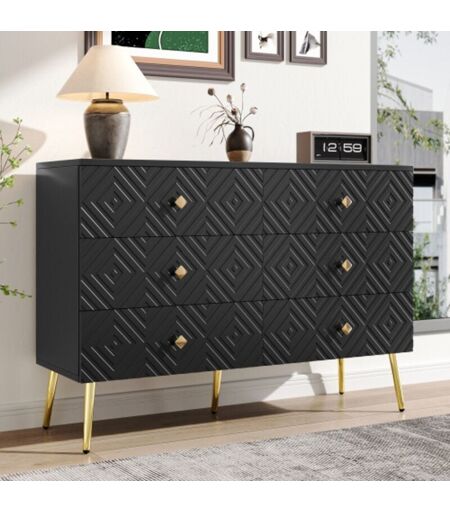 Urban Meuble - Buffet 6 tiroirs noire avec motifs géométriques et pieds dorés 120x40x80cm