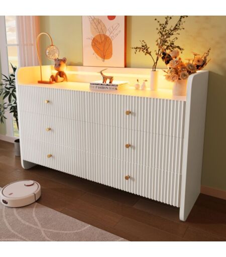 Urban Meuble - Commode blanc motif cannelé 6 tiroirs avec éclairage led poignets dorés