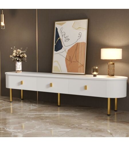 Urban Meuble - Meuble tv blanc ovale 3 tiroirs poignets pieds dorés 174x35x41cm