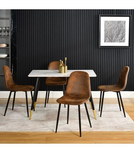 Ensemble table blanche effet marbre et 4 chaises scandinaves rétros WHALEN MARBLE TABLE BG+CHARLTON SUEDE BROWN S FRXZ Vous rêvez d'une salle à manger chic et retro dans l'air du temps, où convivialité rime avec goût ? Ajoutez une touche charme et des couleurs contrastes à votre salle à manger avec notre ensemble table et 4 chaises scandinaves. Le table de 110 cm est idéale pour les réunions en famille ou entre amis. Selon vos envies, misez sur le contraste des couleurs et des matières : cet ensemble table et chaises est équipé de pieds en métal noir pour assurer une bonne stabilité à l'ensemble et doré sur les points de pieds de la table apporte une touche chic et glamour dans l'ambiance. Style moderne et élégante : Cette table à manger blanche présente un design effet marbre et pieds noir, avec les chaises look rétro et leur tissu effet suède/daim doux au toucher, ensemble cette combination raffinée et ses lignes épurées ajouter une touche de charme vintage à votre espace de vie. ...