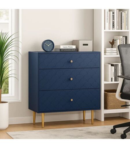 Réinventez votre coin lecture ou espace de travail avec ce meuble bibliothèque original à 3 tiroirs, qui allie design artistique et fonctionnalité. Avec sa teinte bleu marine profonde, ses pieds en métal doré et ses façades de tiroirs ornées d’un élégant motif en relief façon écailles, ce meuble se démarque comme une pièce maîtresse raffinée pour votre intérieur. Pensé comme une alternative compacte aux bibliothèques traditionnelles, ce meuble offre une solution de rangement à la fois esthétique et pratique. Bien qu’il n’ait pas d'étagères ouvertes visibles, ses trois grands tiroirs permettent de ranger une multitude de livres, carnets, documents, magazines ou accessoires de lecture à l’abri de la poussière. Il convient parfaitement aux petits espaces qui nécessitent une organisation discrète et stylée. Les tiroirs, généreux en capacité, sont dotés de poignées rondes en métal doré, apportant une touche de brillance et facilitant l’ouverture. Le motif en relief en forme d’écailles sur ...