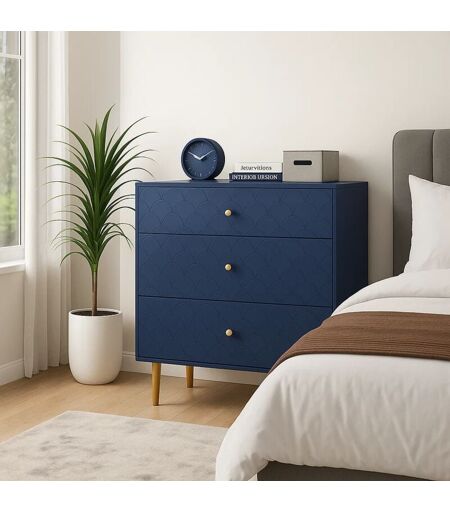Apportez une touche d’élégance contemporaine à votre chambre avec cette table de chevet à trois tiroirs. Alliant esthétique raffinée et fonctionnalité, ce meuble bleu marine séduit par son design unique à motif écailles en relief, ses finitions mates et ses pieds dorés qui ajoutent une note de luxe à votre espace nuit. Parfaitement proportionnée pour être placée à côté de votre lit, cette table de chevet offre un espace de rangement généreux grâce à ses trois tiroirs spacieux. Vous pouvez y ranger vos livres, lunettes, produits de soin, chargeurs ou tout autre objet du quotidien que vous souhaitez garder à portée de main. Chaque tiroir est équipé d’une poignée ronde en métal doré qui facilite l’ouverture tout en apportant une touche de raffinement. Le motif en relief en forme d’écailles sur les façades de tiroirs confère au meuble une texture visuelle originale et tendance, idéale pour sublimer une chambre moderne, chic ou même de style Art déco. La finition bleu foncé mate est non ...