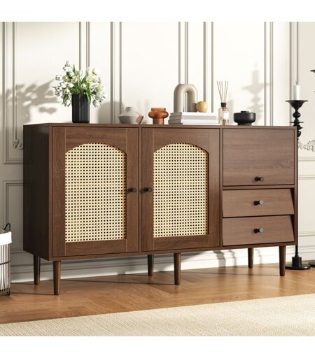 Urban Meuble - Buffet vintage effet bois avec portes en rotin 2 portes 2 tiroirs 130x75,5x40cm