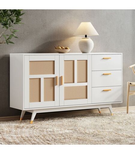 Urban Meuble - Buffet blanc en rotin 2 portes 3 tiroirs poignets dorés 160x40x87cm