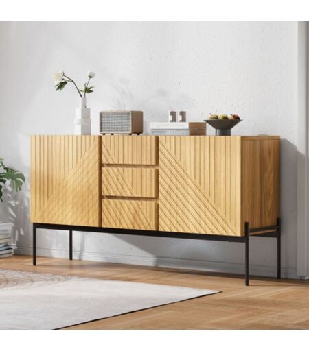 Urban Meuble - Buffet moderne effet bois naturel avec portes sculptées et piétement métallique 150x40x75cm