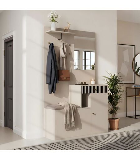 Vestiaire à l'entrée blanc avec miroir, banc, porte-manteau et meuble de à chaussures 2 portes 1 tiroir Accueillez vos invités avec style grâce à cet ensemble de meuble d'entrée compact et sophistiqué. Conçu pour maximiser l'espace dans les couloirs ou les petites entrées, il combine un vestiaire mural , un grand miroir , un banc d'assise confortable et un meuble de rangement pratique. Les façades de tiroirs rayées uniques ajoutent une touche de design contemporain à la finition Beige et Crème , tandis que les matériaux MDF de haute qualité garantissent sa durabilité. C'est la solution tout-en-un élégante pour organiser vos manteaux, chaussures et accessoires essentiels dès l'arrivée. Conception polyvalente 5-en-1 : Intègre un meuble à chaussures, un banc rembourré, un grand miroir, des patères et un espace de rangement mural, parfait pour les entrées. Matériaux premium et durabilité : Fabriqué en panneau de fibres de bois de moyenne densité (MDF) de haute qualité pour une résistance ...