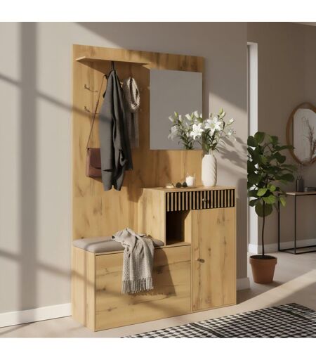 URBAN MEUBLE Vestiaire à l'entrée effet bois avec miroir, banc, porte-manteau et meuble de à chaussures 2 portes 1 tiroir