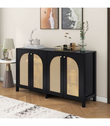 Urban Meuble - Buffet vintage noir 4 portes en rotin courbées 145x40x80cm