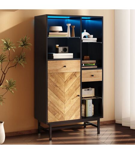 Urban Meuble - Buffet vitrine effet bois motif triangulaire tiroirs et étagères en verre avec led 80x40x150cm