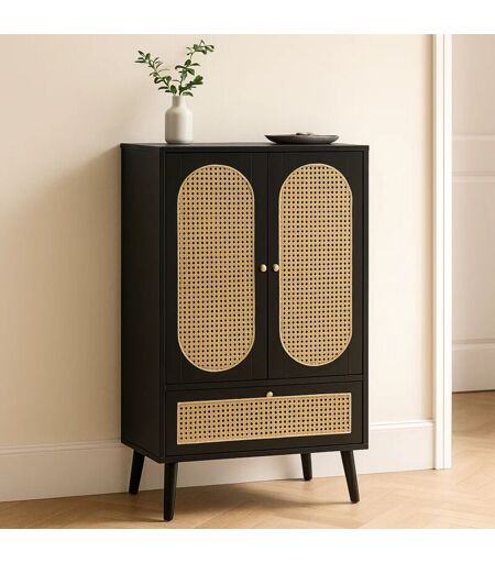 Urban Meuble - Meuble à chaussures haut noir en rotin 2 portes et 1 tiroir 60x40x110,5 cm