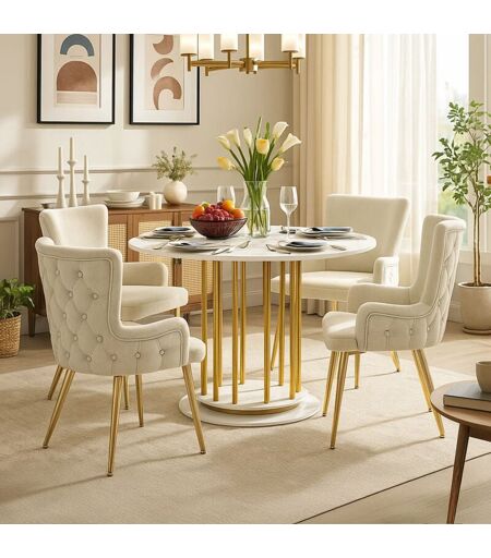 Ensemble de salle à manger de style scandinave avec une table à manger effet marbre blanc et des chaises rembourrées en velours beige URCEIN WHITE+CRORQREONS BEIGE G*2 Cet ensemble de salle à manger élégant et moderne transformera votre salle à manger, que ce soit pour un dîner décontracté ou des réceptions élégantes. Son plateau effet marbre blanc raffiné apporte une touche de sophistication, tandis que sa structure robuste et élégante en métal doré foncé crée une ambiance chic et moderne qui s'intègre parfaitement à tout décor moderne. Les quatre chaises assorties sont recouvertes de velours doux pour plus de confort et de style. Leur conception ergonomique offre un soutien optimal, idéal pour les repas prolongés ou les conversations informelles. Cet ensemble de salle à manger s'adapte à une variété d'environnements, des cuisines modernes aux salles à manger, alliant praticité et esthétique. Sa palette de couleurs neutres et ses matériaux de haute qualité le rendent polyvalent et ...